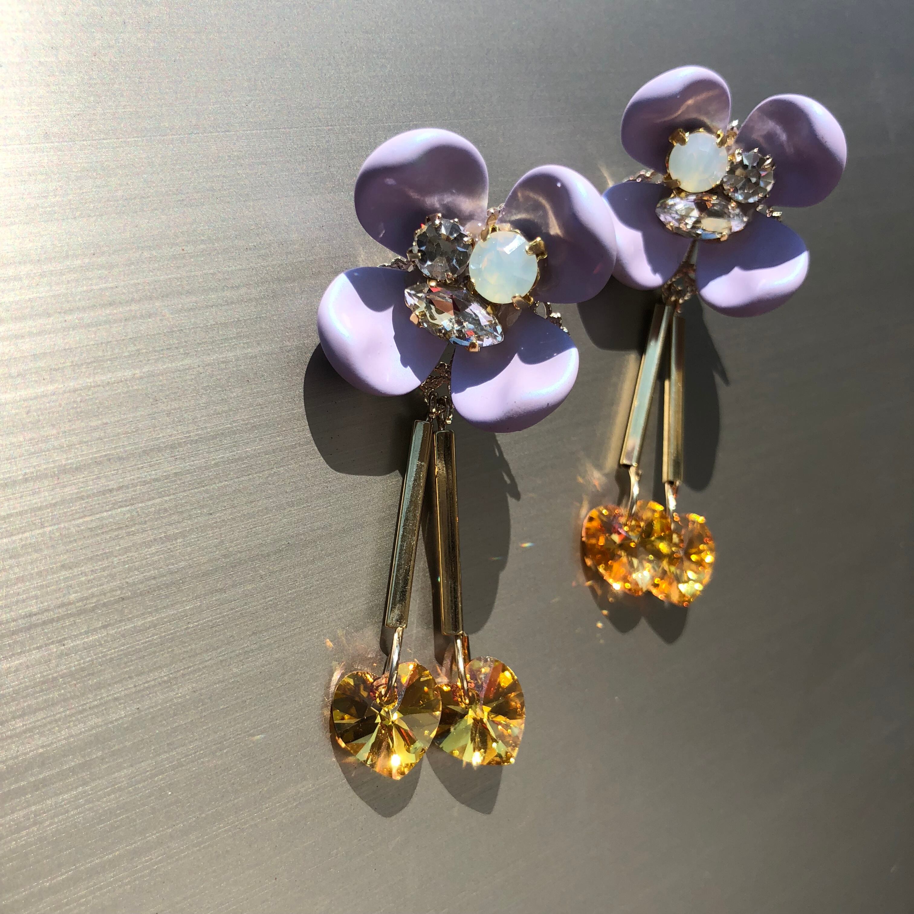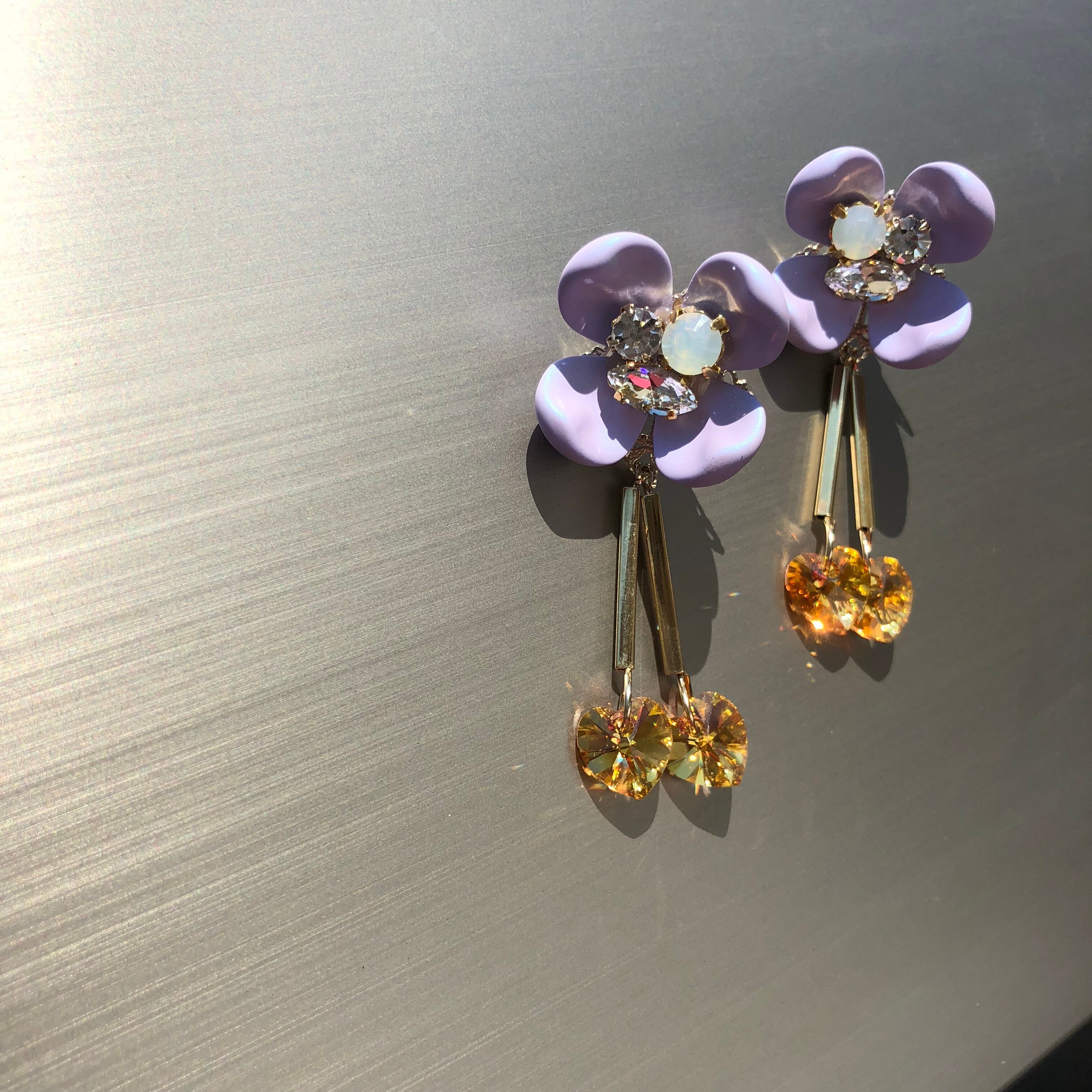 タンジェリンのスワロフスキーのハートが2粒ずつゆらゆらきらきらしてとってもかわいいデザインですよ☆