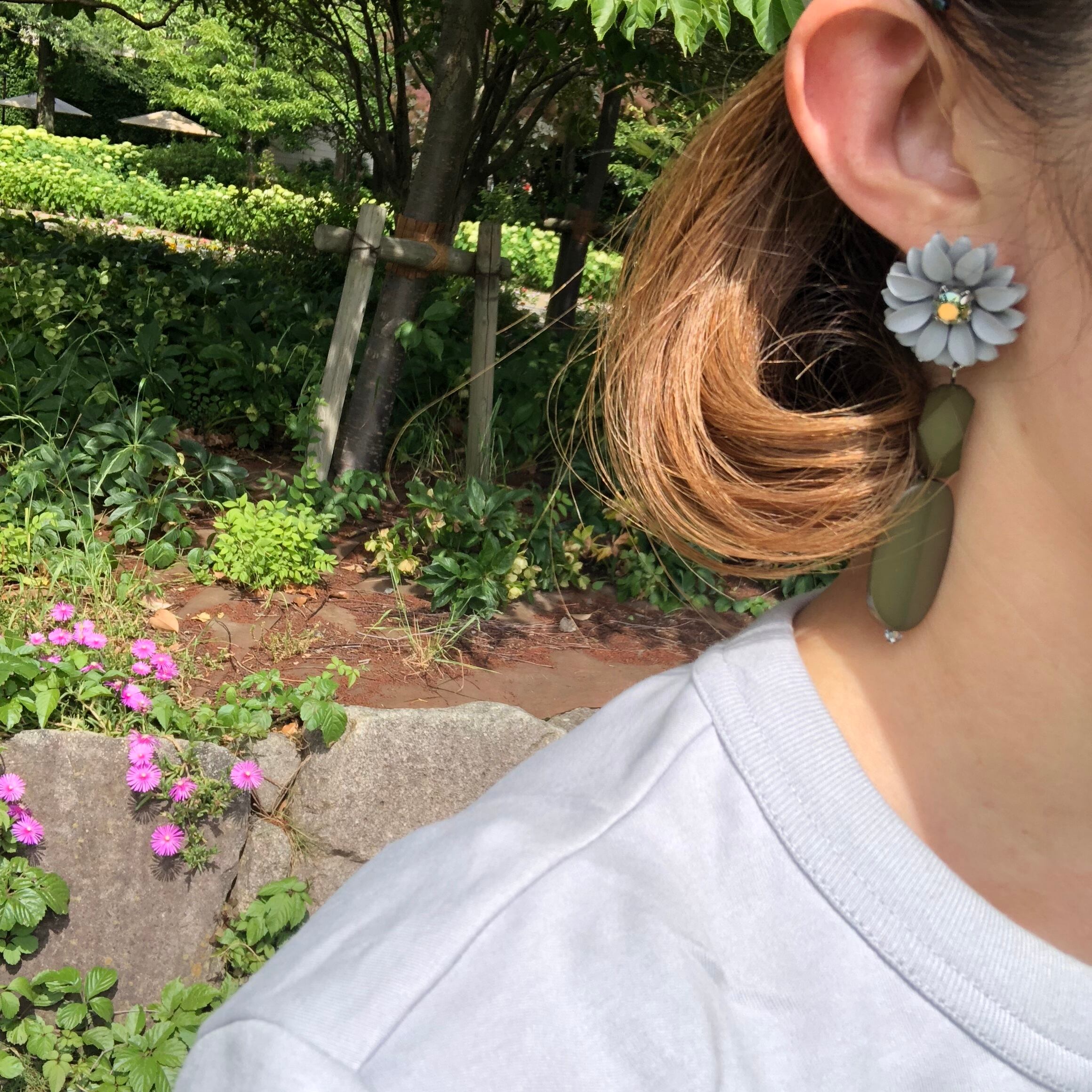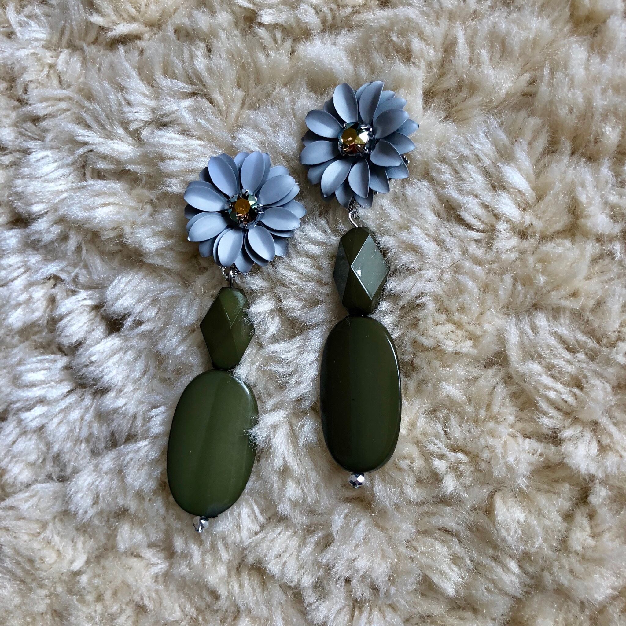 ライトグレー のflower の真ん中にはカーキオーロラのようなお色のスワロフスキーがきらきらしてます。その下には、カーキの2型のアクリルパーツとシルバービーズがゆらゆらとするデザインです。