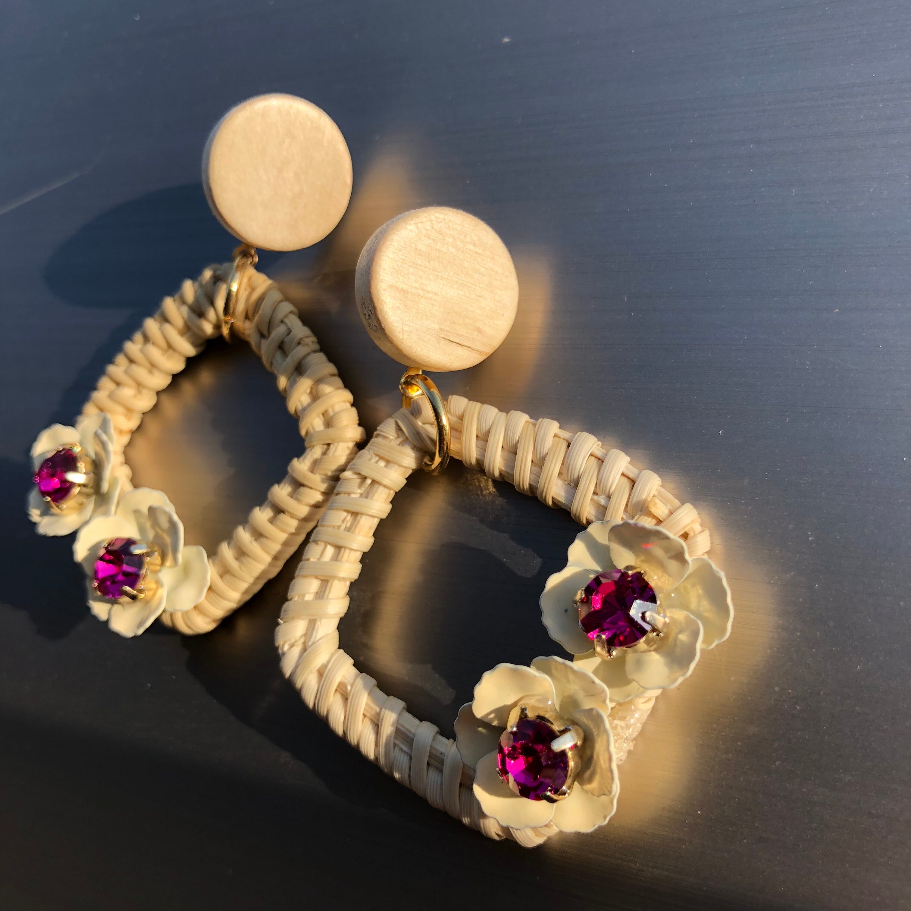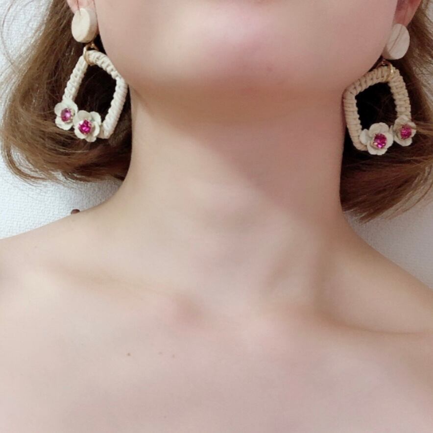 ナチュラルカラーのウッドやカゴのように編んだスクエアパーツに同系色のナチュラルフラワーがかわいくついています☆お花の真ん中にはポイントとなる発色の良いピンクのbijouがキラキラしています☆