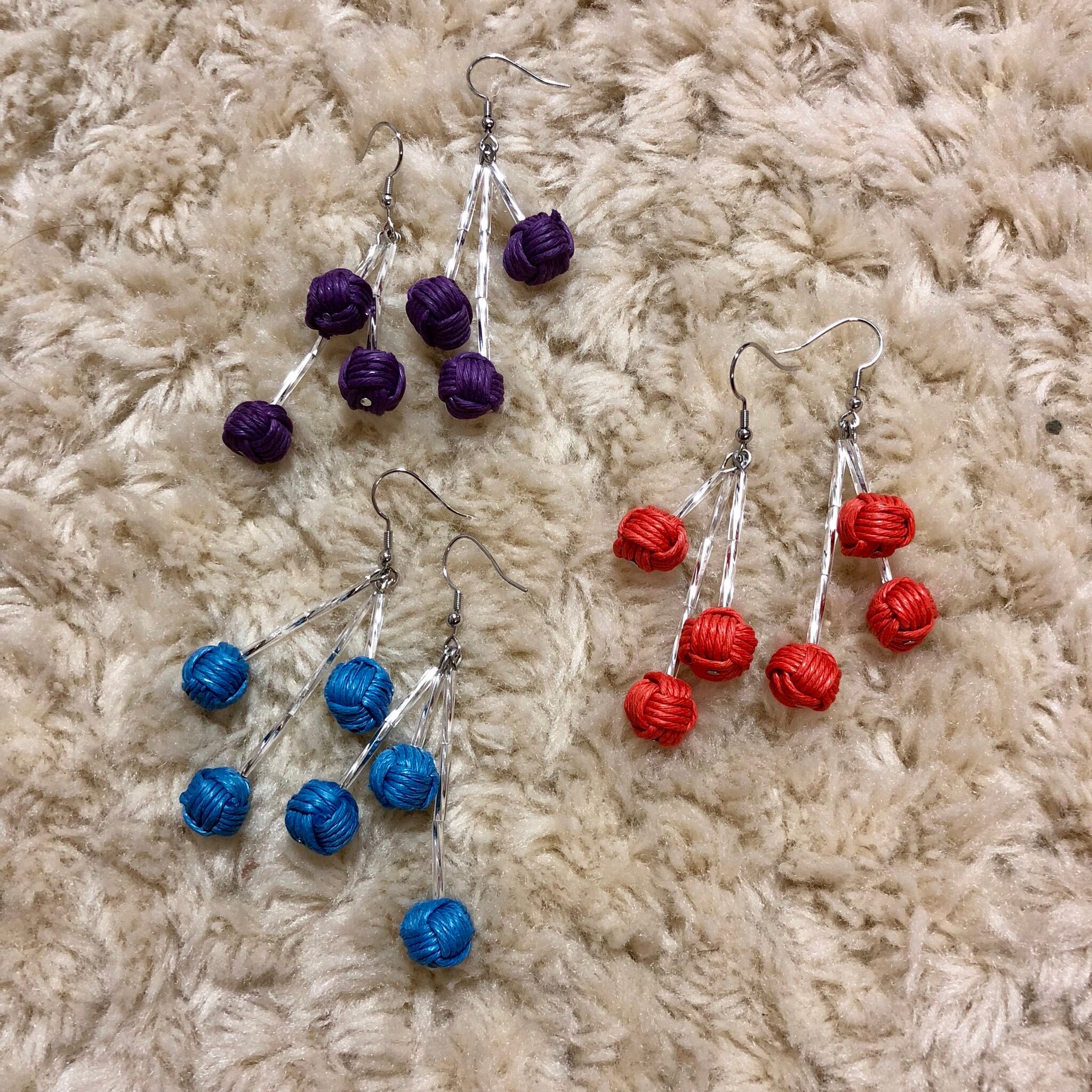 毛糸を巻き巻きしたような丸いパーツを使用したカラフルなゆらゆらピアス、イヤリングです☆