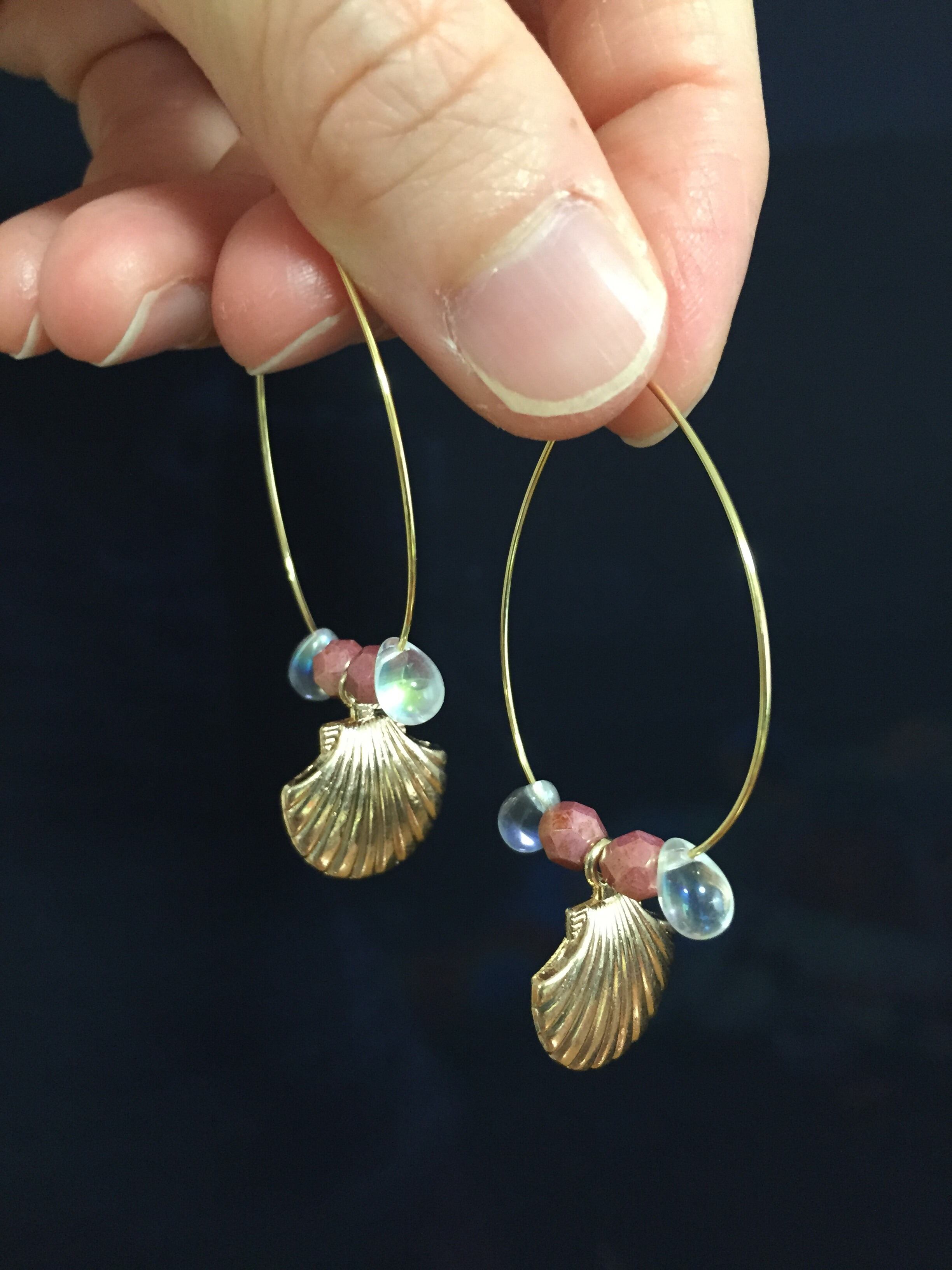 しずく型のゴールドフープに白系とピンク系のパーツとシェルモチーフがぶらさがってます☆ピアスでもイヤリングでも可能です。