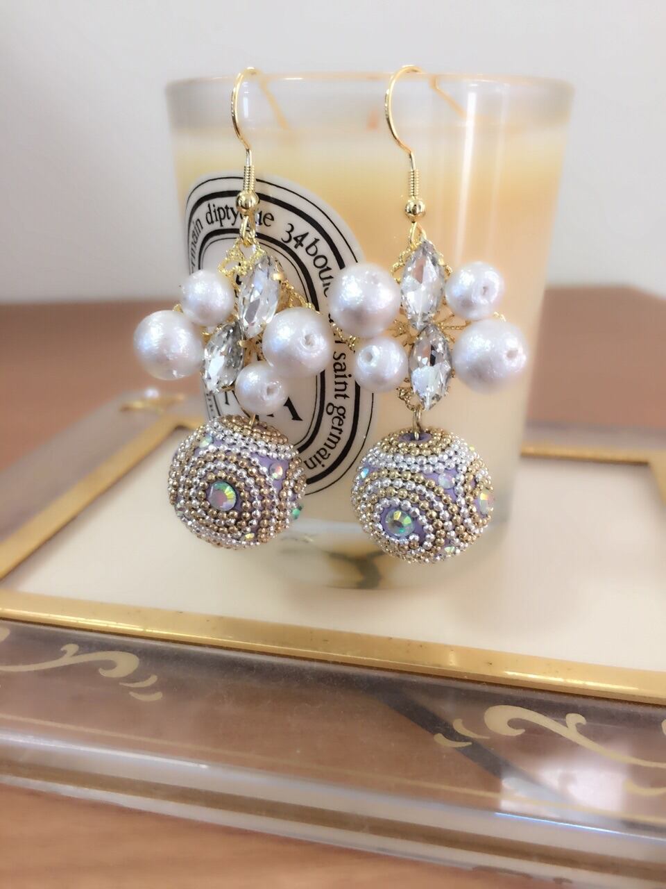 コットンパールとキラキラボールのピアスです。全体的にホワイトな印象で、とてもお上品なピアスです。
