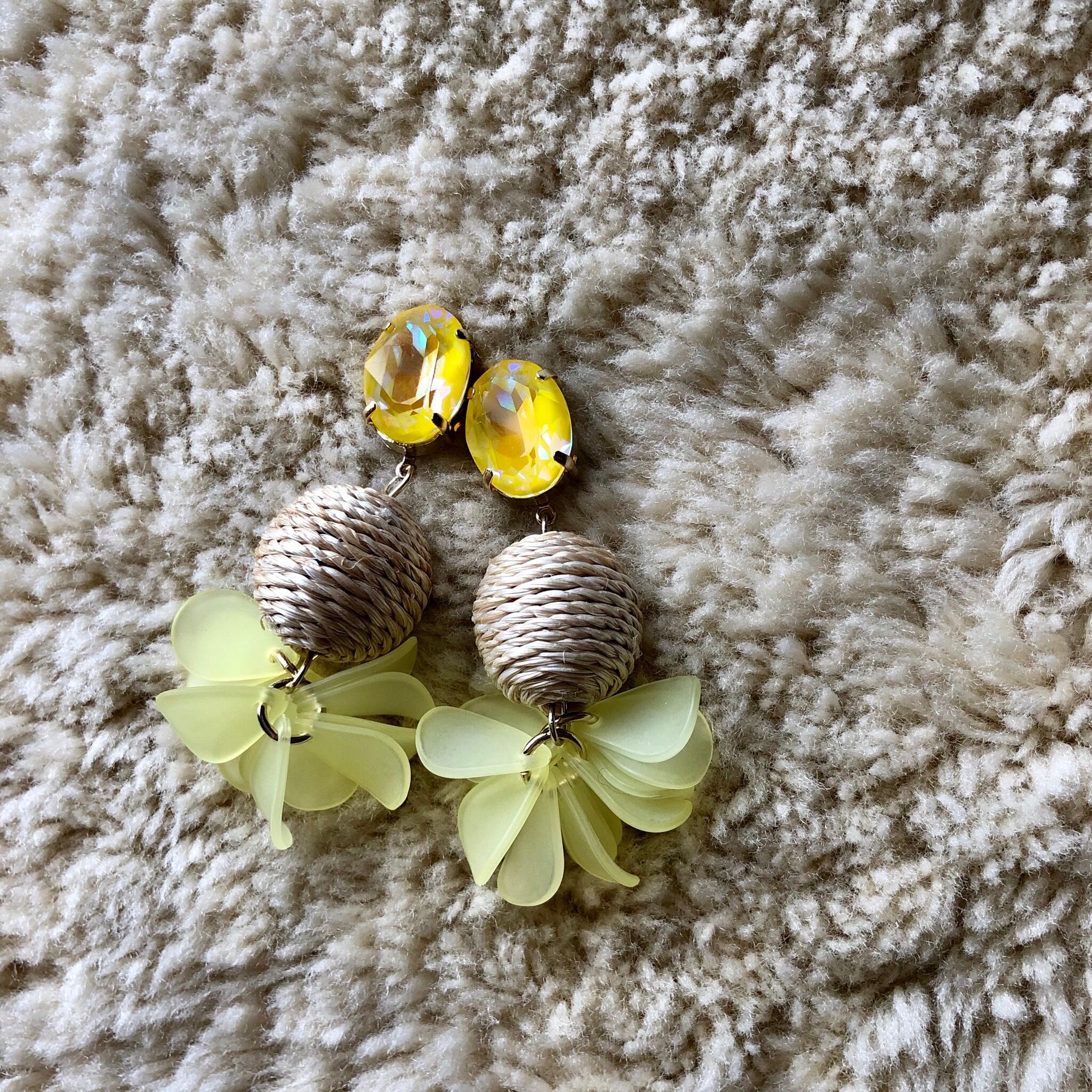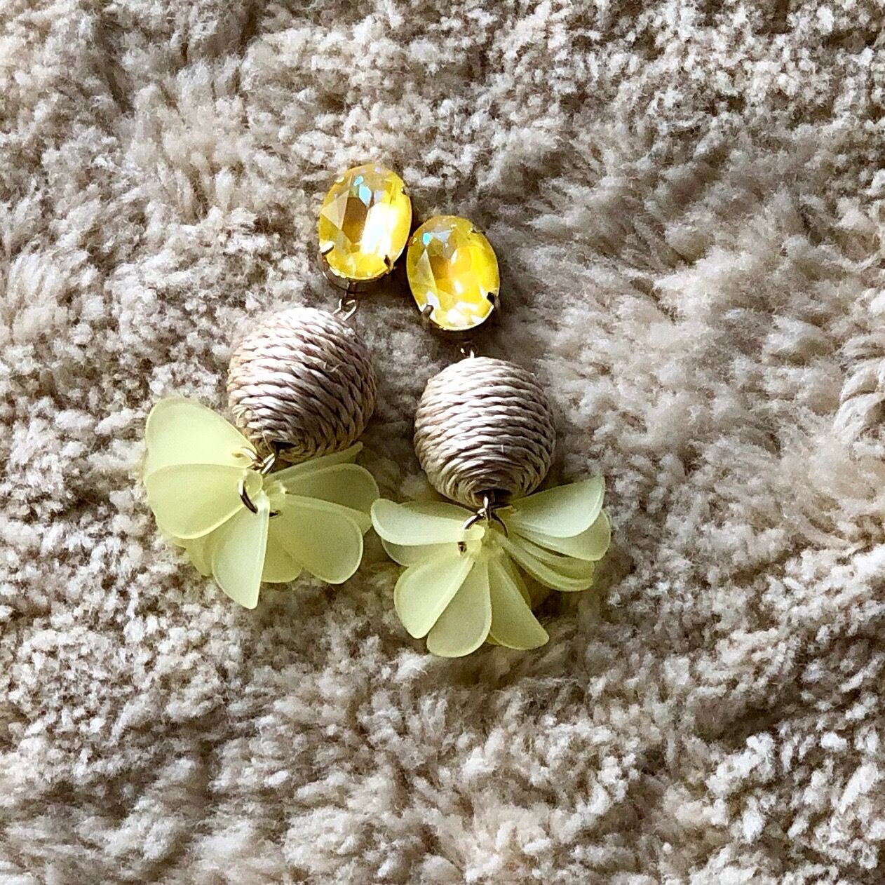 スワロフスキーの新色のイエローとパステルイエローの花びら、リネン素材のボールを使用しました!