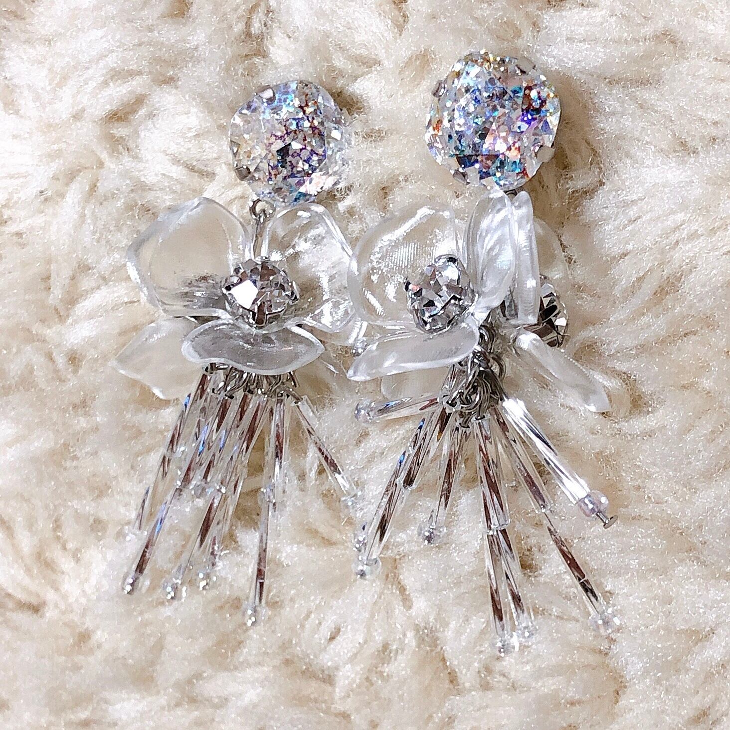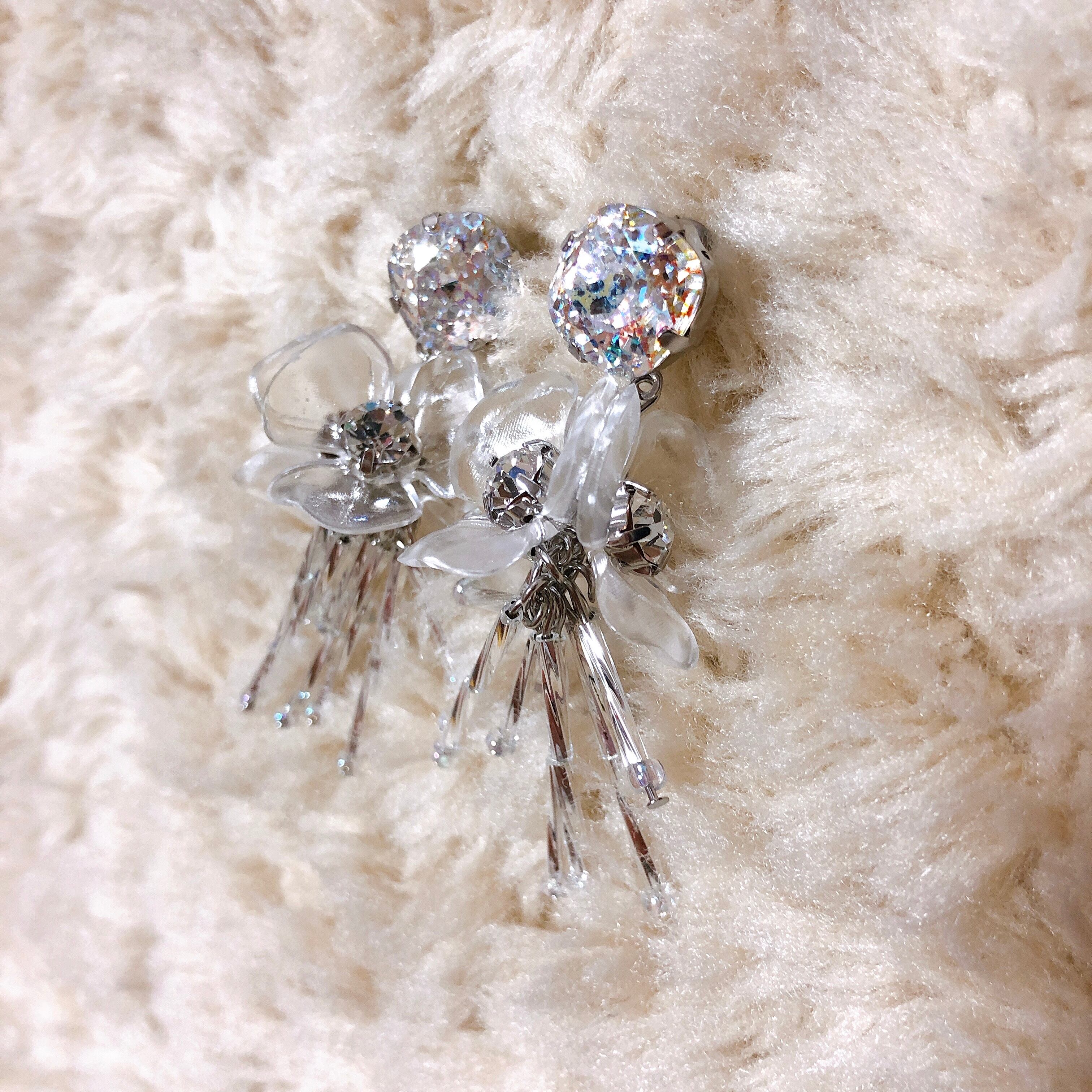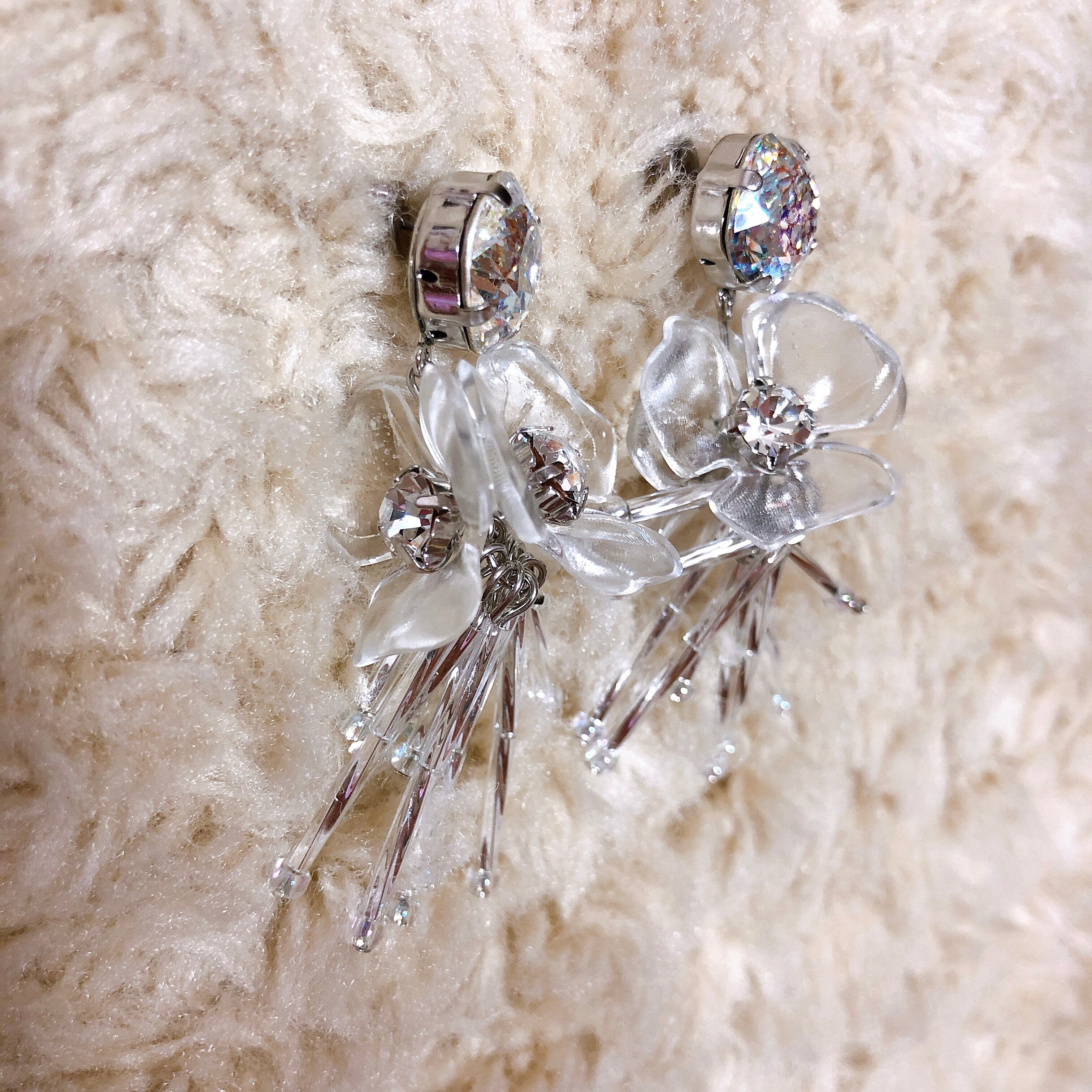 マーブル模様のあるクリアのスワロフスキーから3Dのお花とフリンジビーズがゆらゆらするクリアアクセサリーです☆