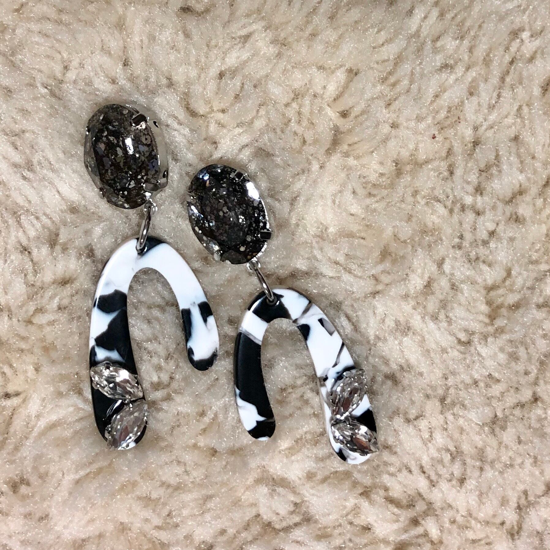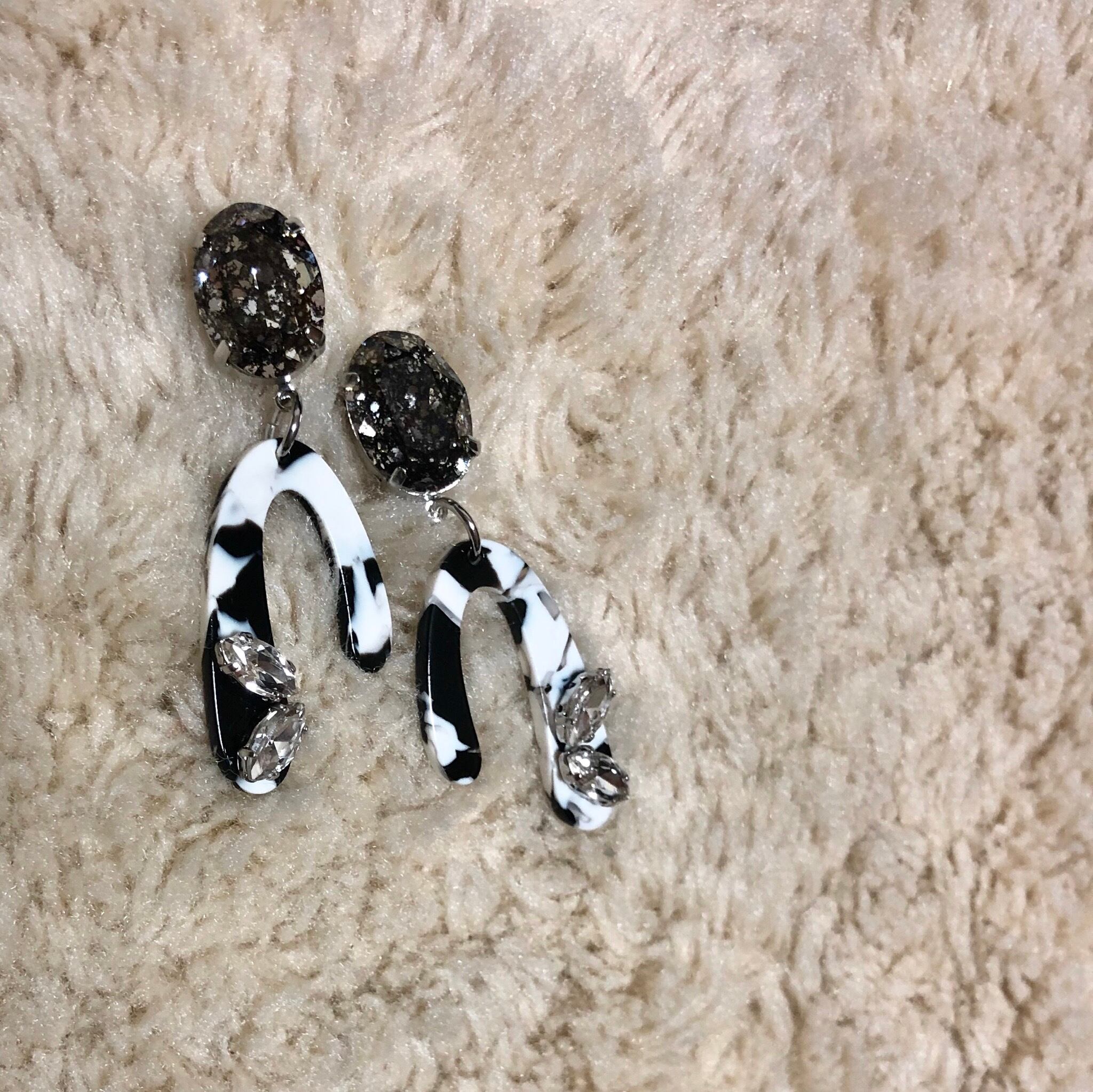 マーブル模様のスワロフスキーの下にビジューのついたアシンメトリーなアクリルパーツ がゆらゆらするデザインです。