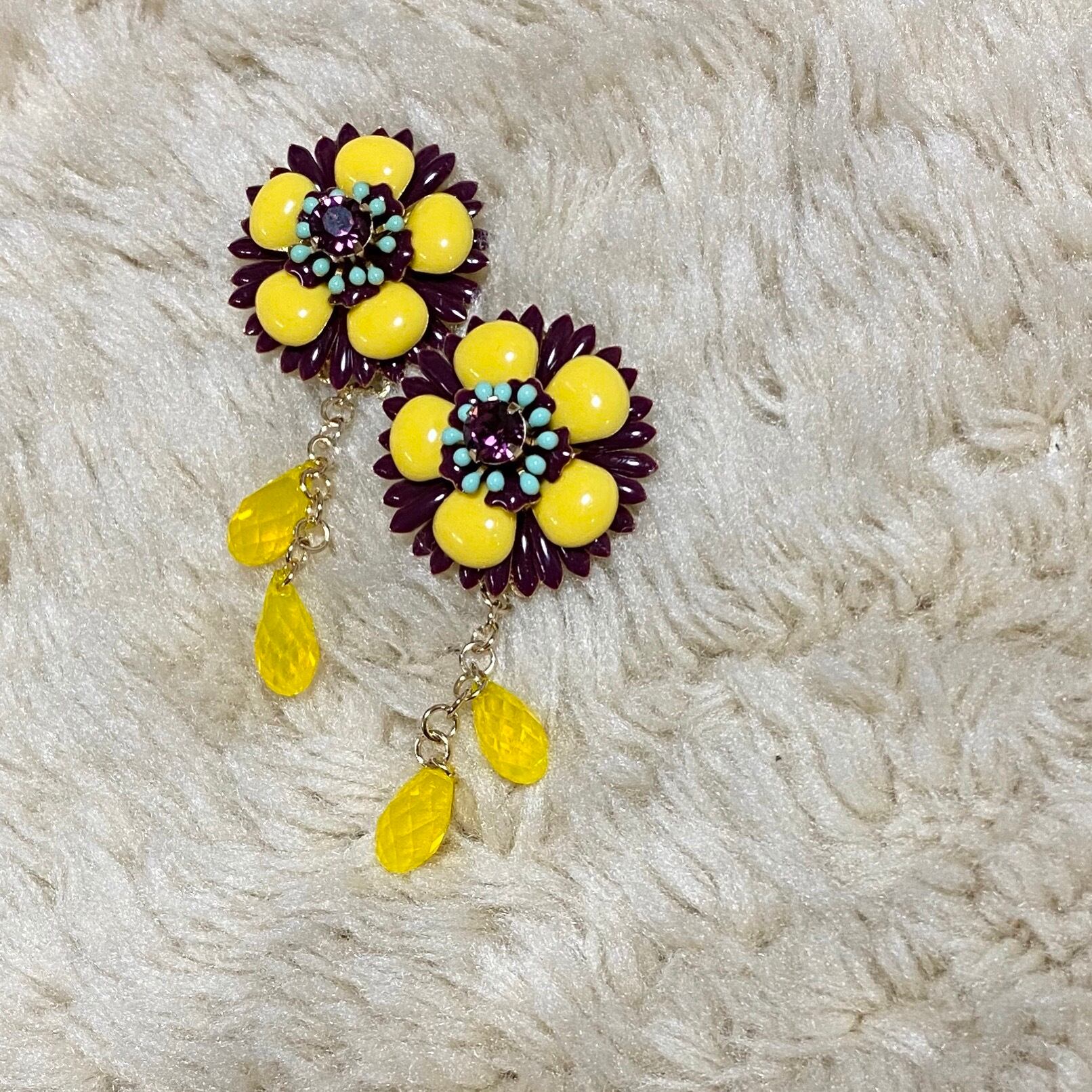 こちらは、パープルの細かい花びらにイエローの丸みのある花びらが重なっているお花で真ん中にはアメジストのスワロフスキーがキラキラしています。