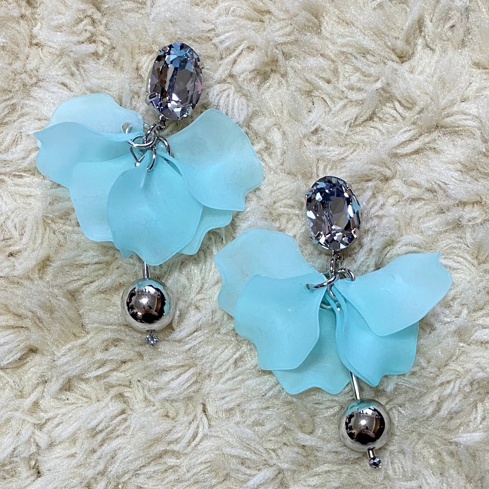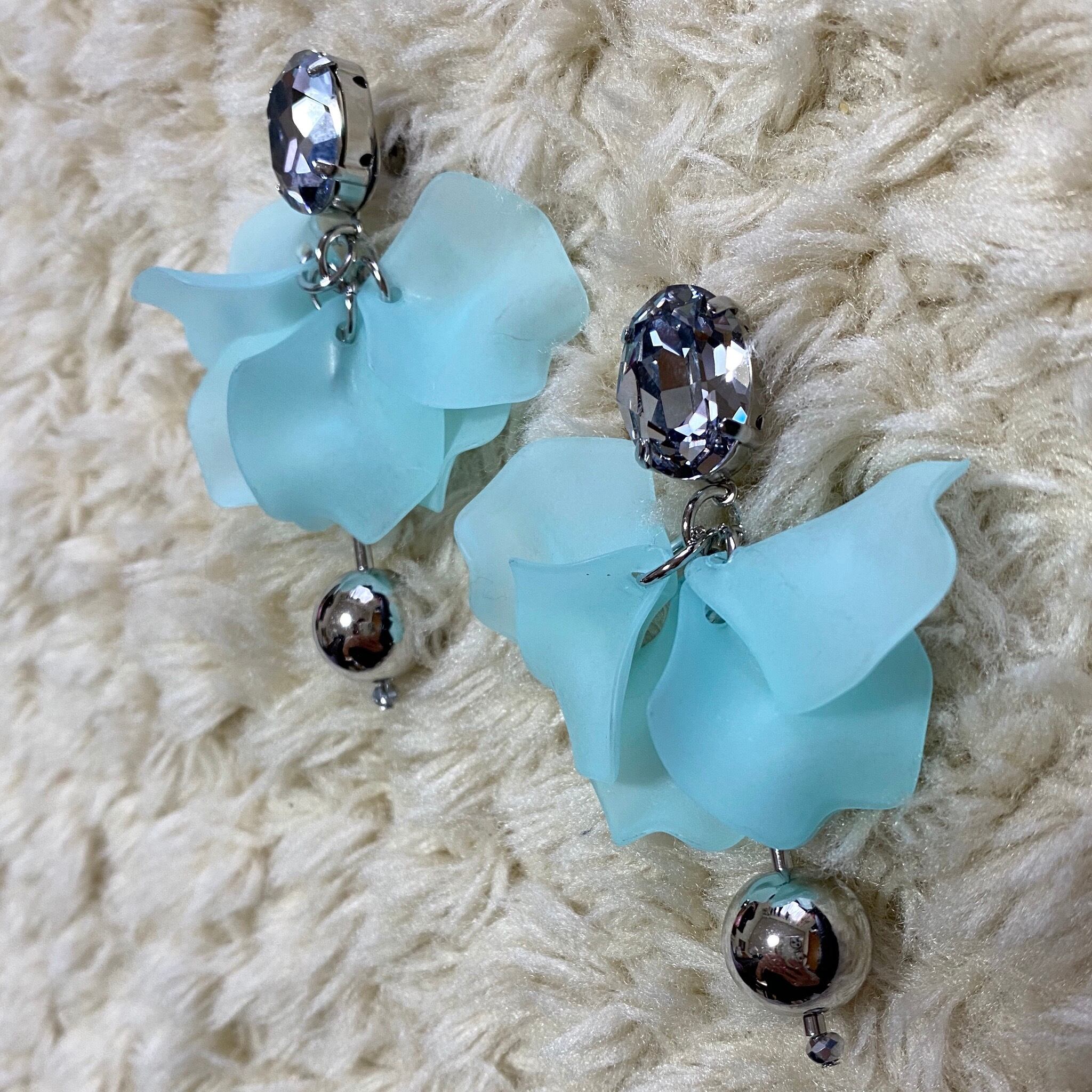 大きめスワロフスキーにアイスブルーの綺麗な花びらとその下にシルバーのスティックとボールがゆらゆらするクールなデザインです☆