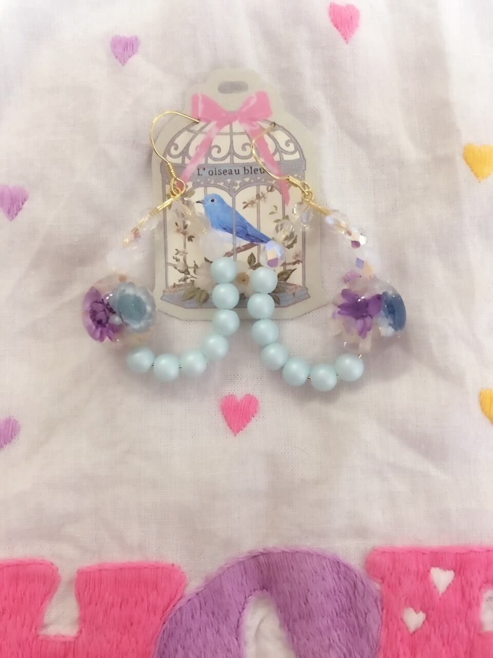 押し花のうめこまれたクリアボールがかわ涼しげな色合いの雫型フープイヤリング/ピアスです。