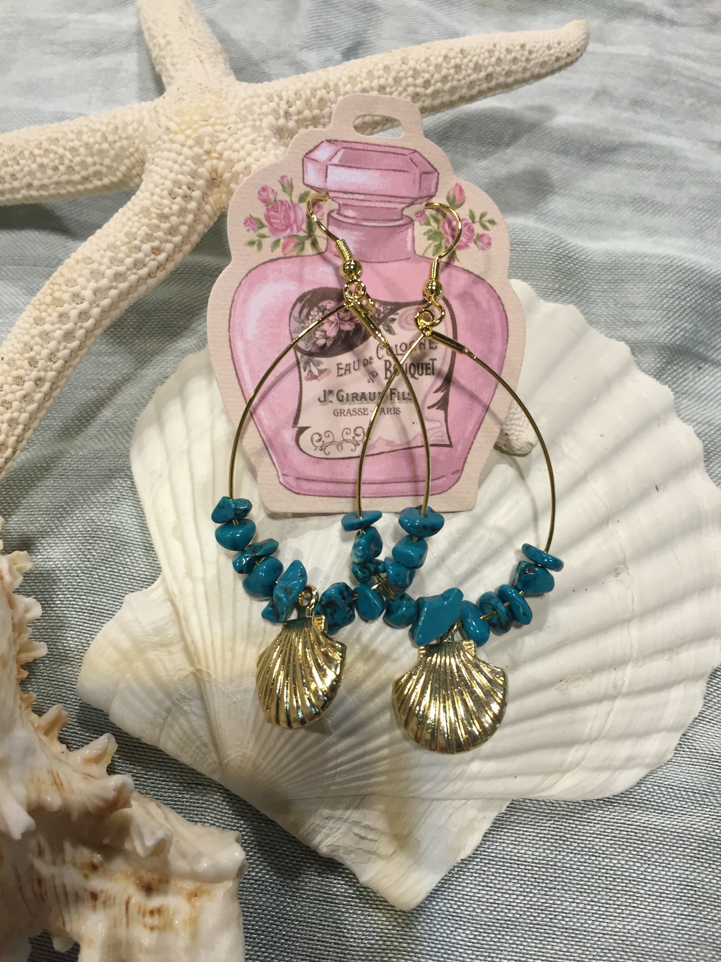 shellとturquoiseのパーツがかわいいしずく型のフープピアスです☆