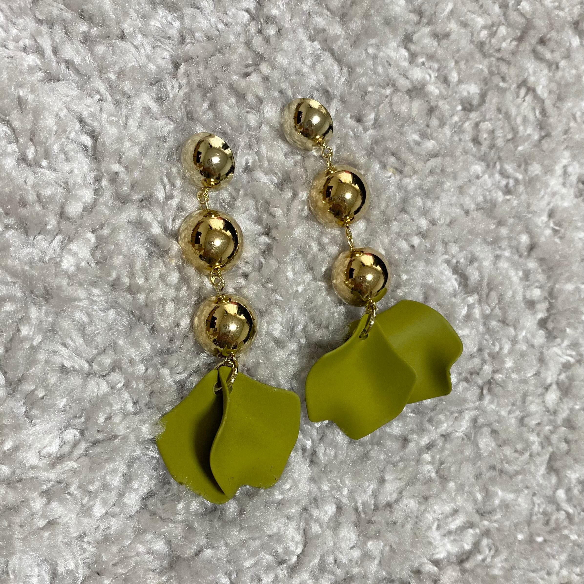 3つのゴールドのボールとその下にくすんだ黄緑色の花びらが2枚ゆらゆらします。