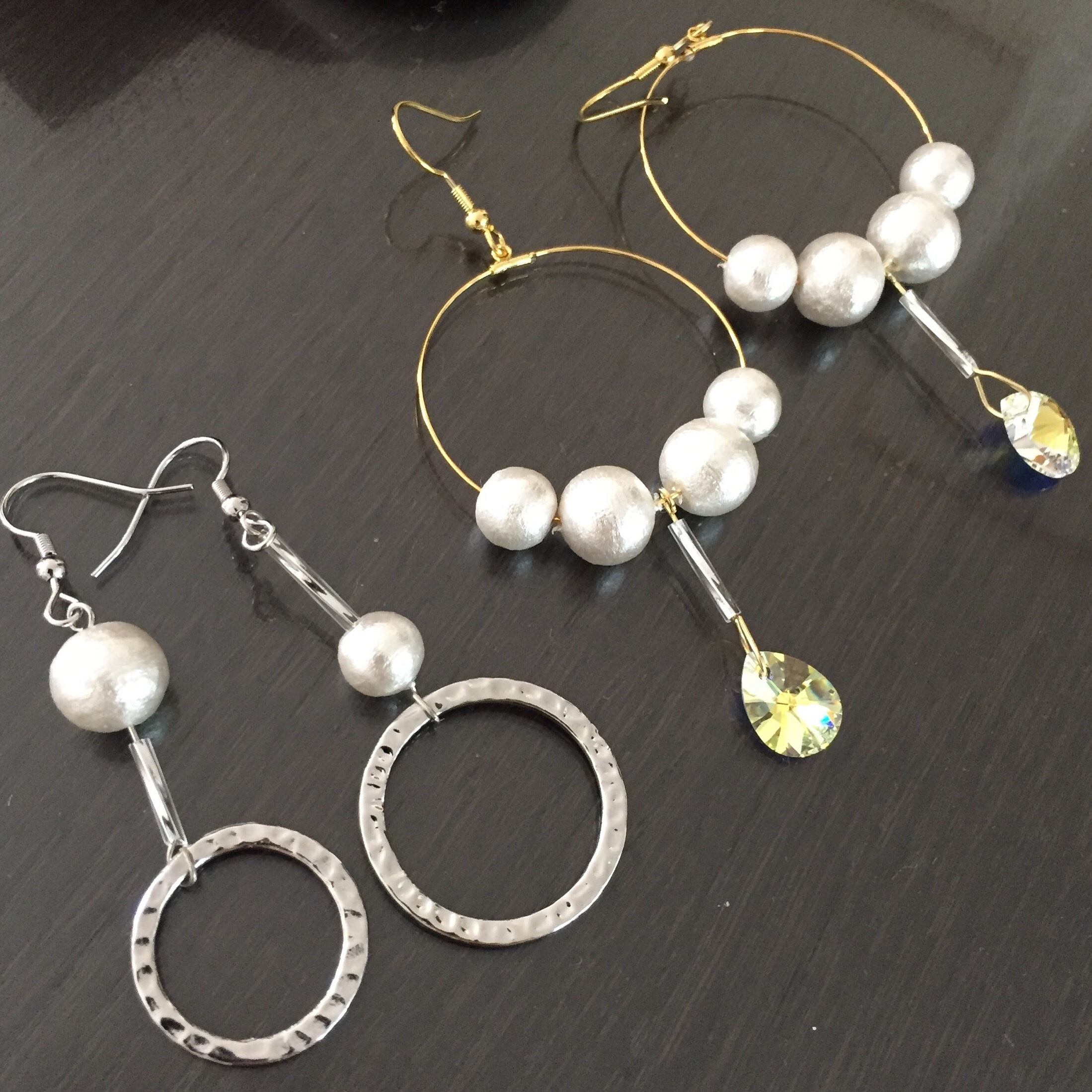 アシンメトリーデザインのシルバーフープとコットンパール、ビーズを使用したピアスです。イヤリングに変更もできます☆