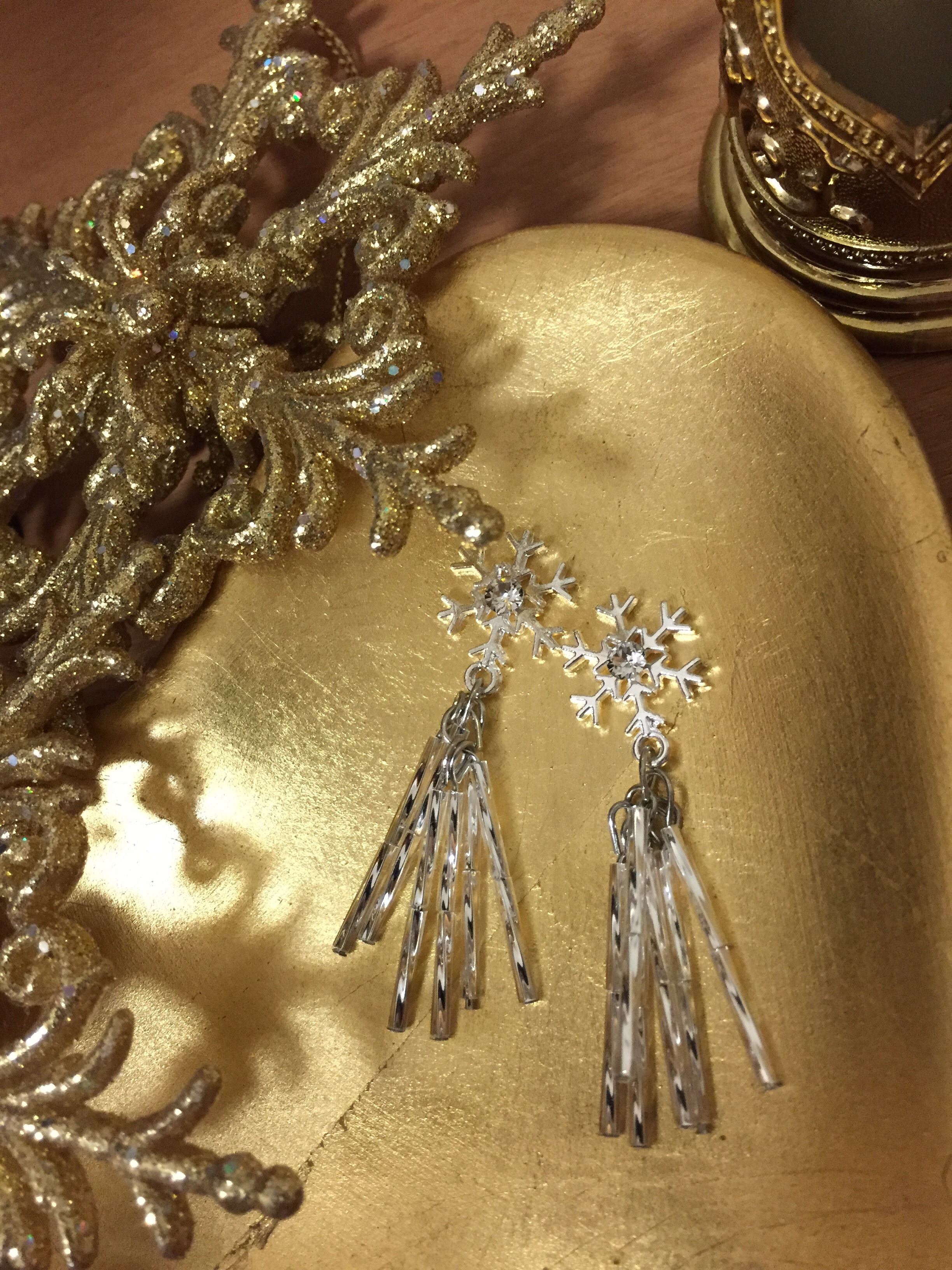 雪の結晶からキラキラのfringeがゆらゆらとしているピアスとなります☆雪の結晶の真ん中にクリアのスワロフスキーがキラキラしています。