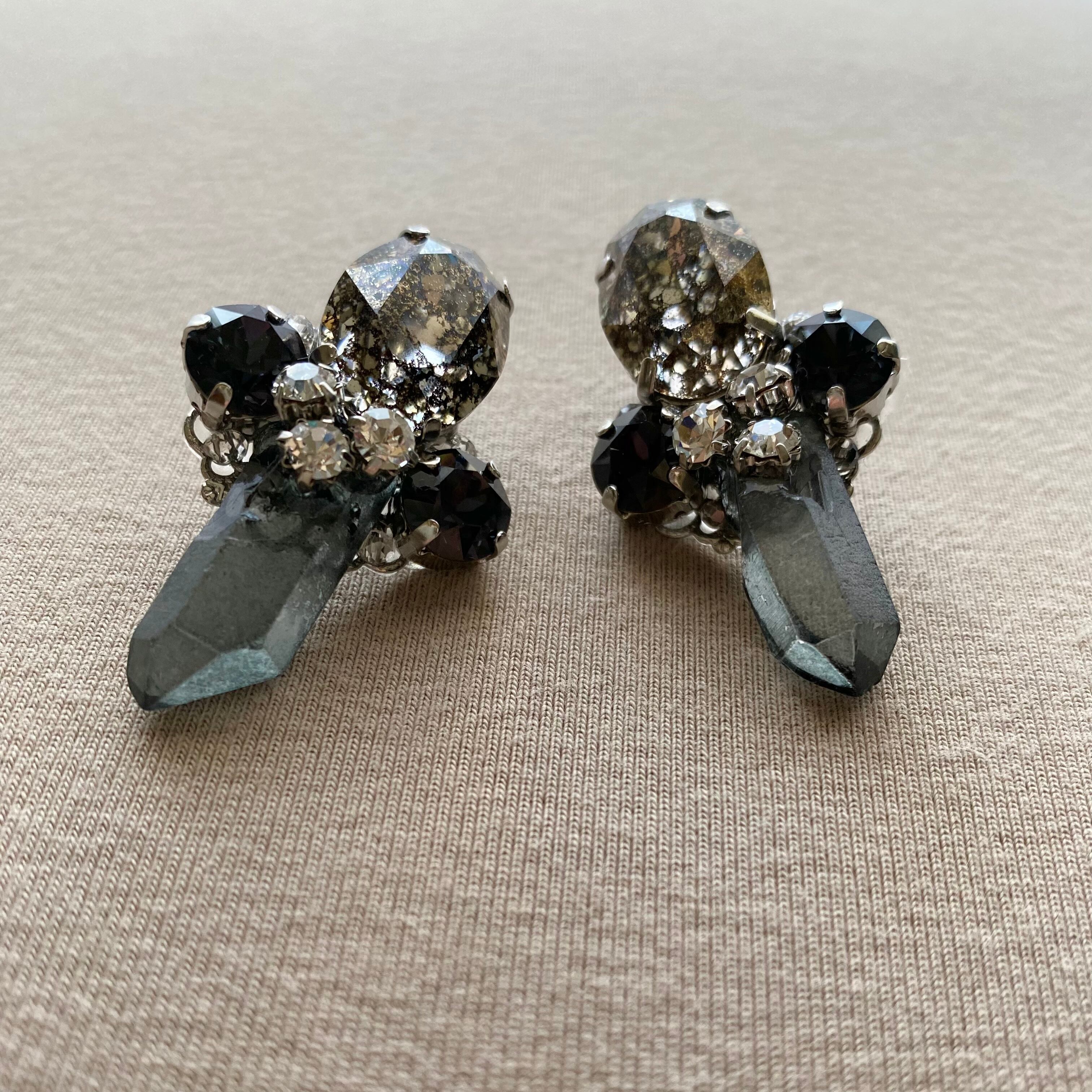 マーブル模様のスワロフスキーとブラックのようなカラーの丸いスワロフスキー、クリアの小粒ビジューとシルバービーズ、縦長のクリスタルでできています。