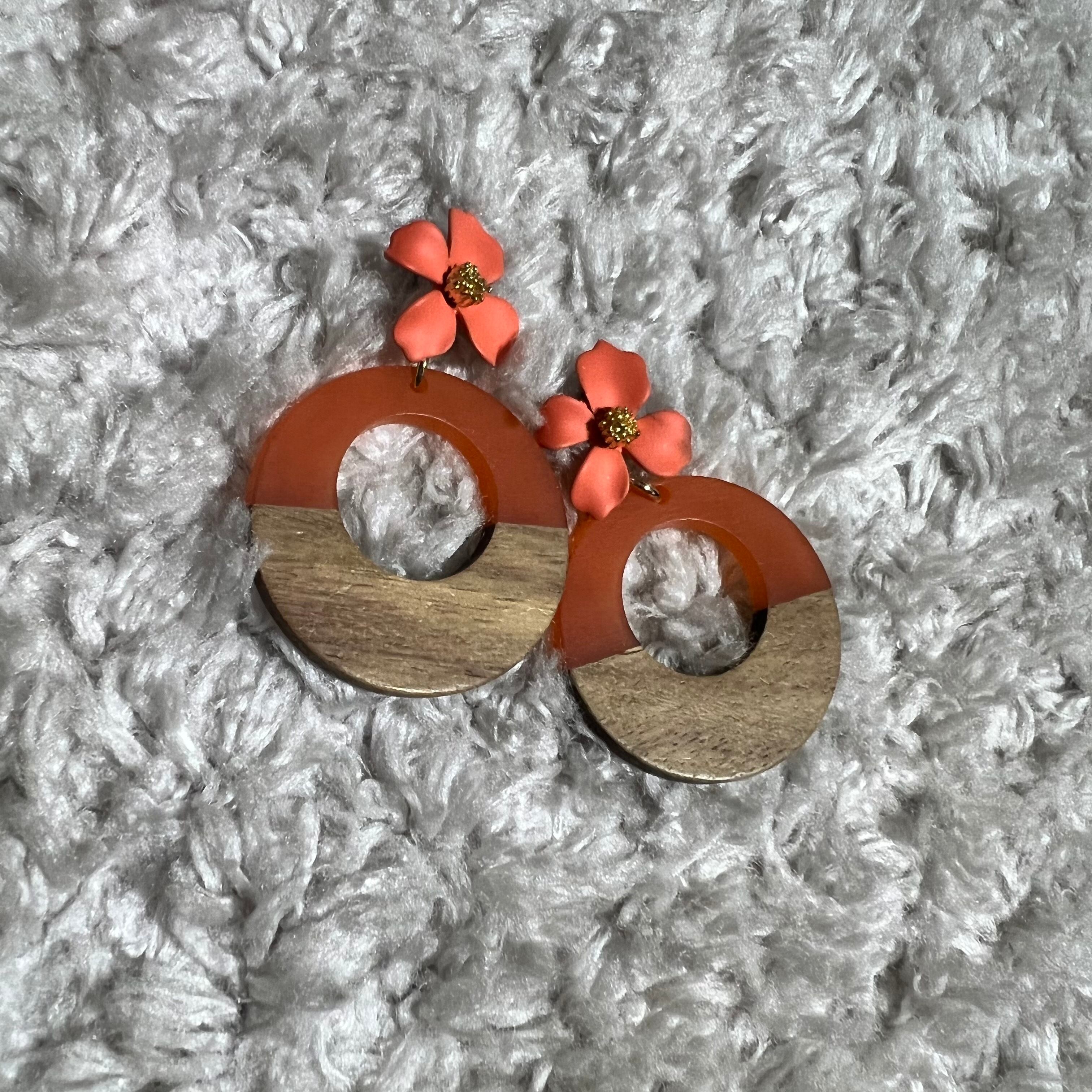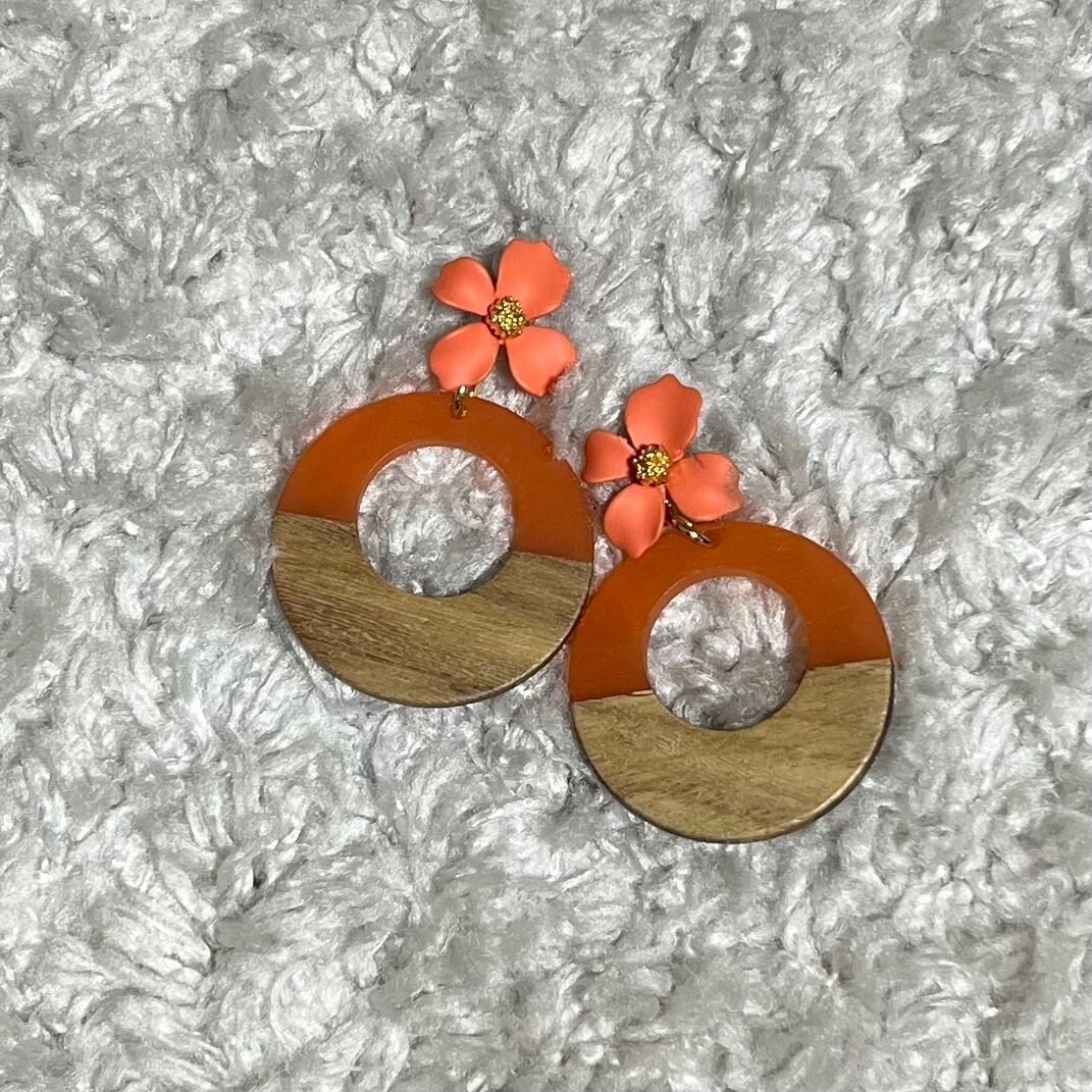 オレンジのお花の下にウッドとアクリルのフープ☆