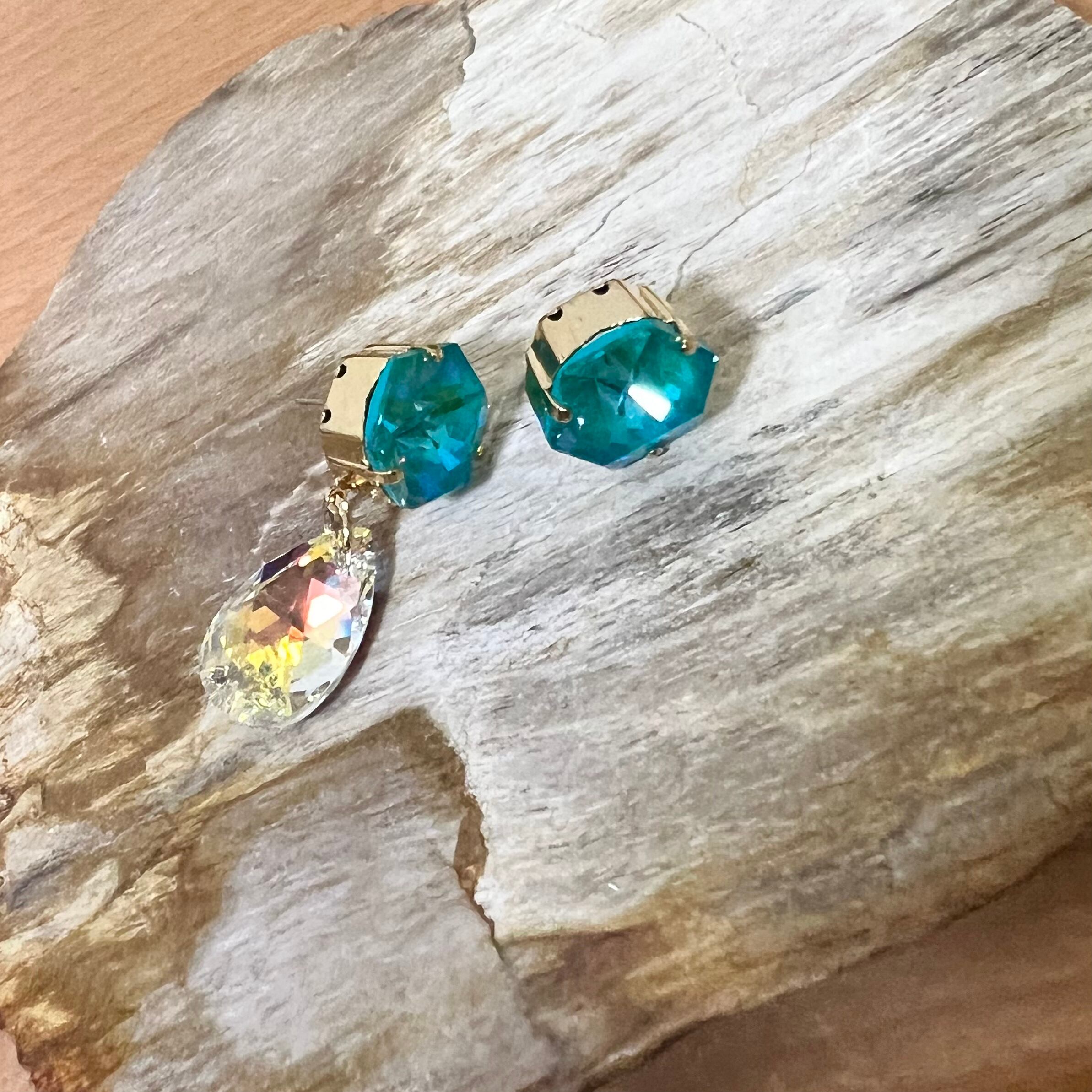 片側が大きめ一粒ピアス、もう一方は雫型のオーロラスワロがゆらゆらするasymmetryデザインです。