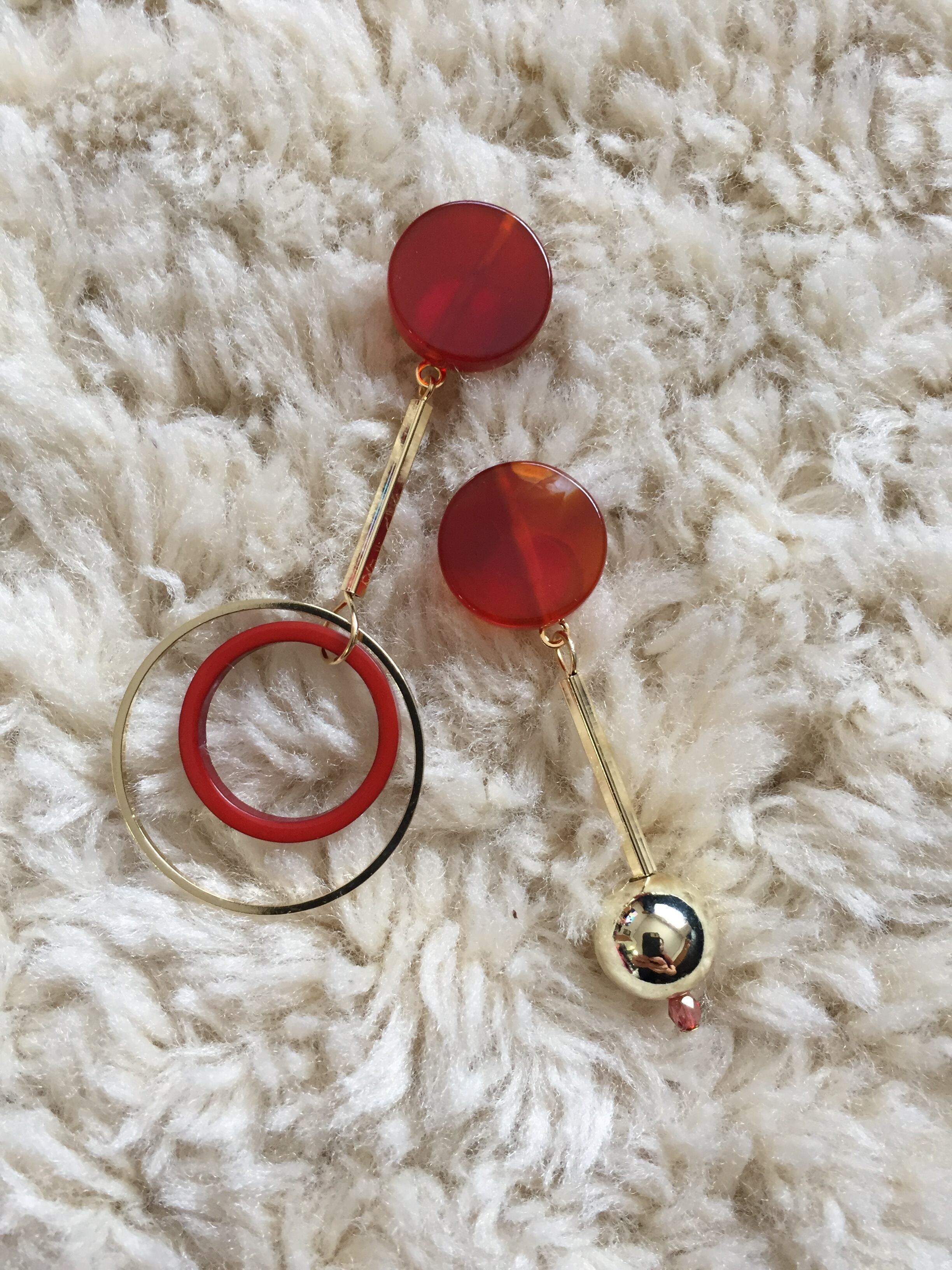 アシンメトリーなデザインといろいろな丸い形の組み合わせがおしゃれなピアス、イヤリングです❤️
