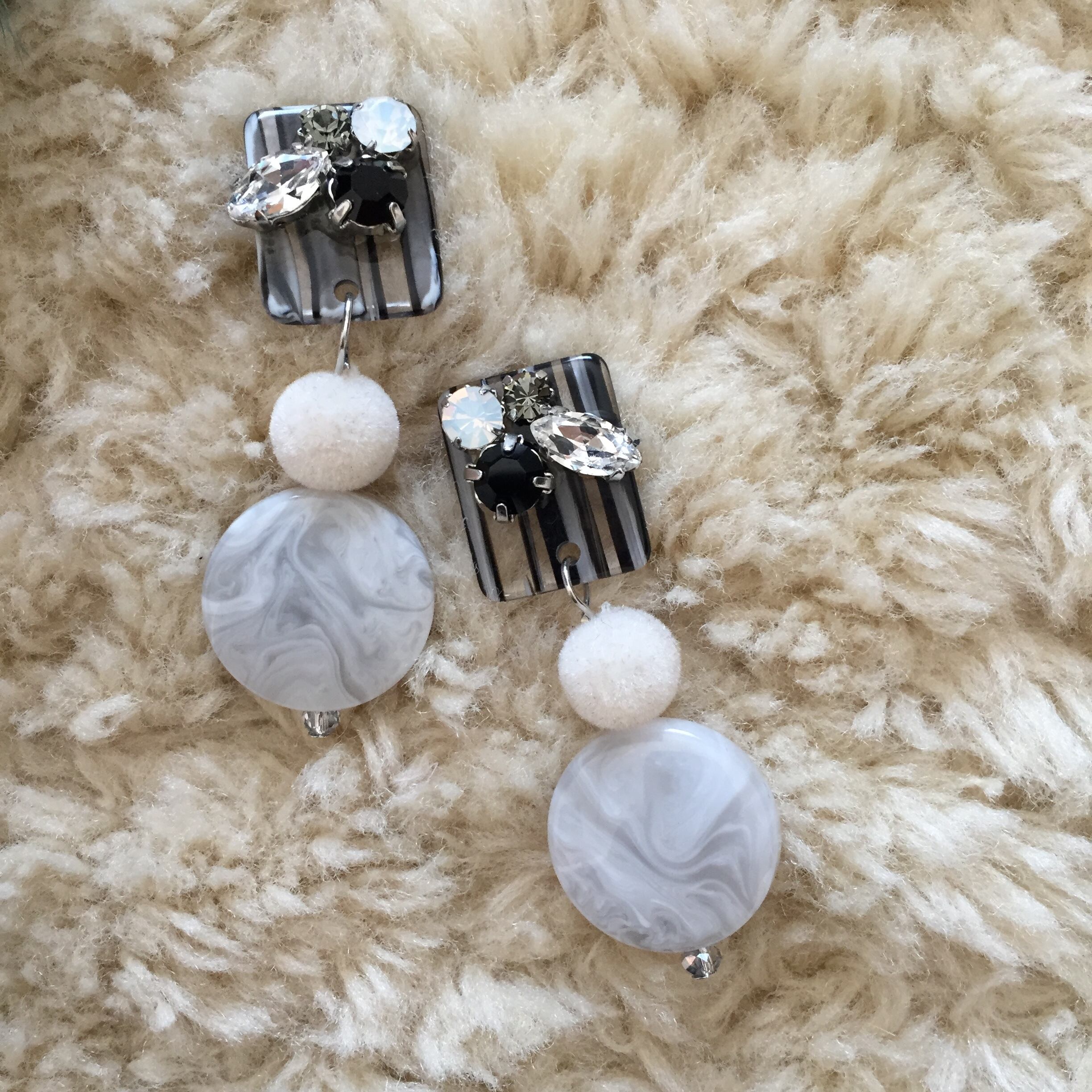 モノトーンストライプのパーツにキラキラビジューのついたオリジナルパーツとホワイトベロア風パーツとマーブルパーツの組み合わせがとてもかわいいですよ