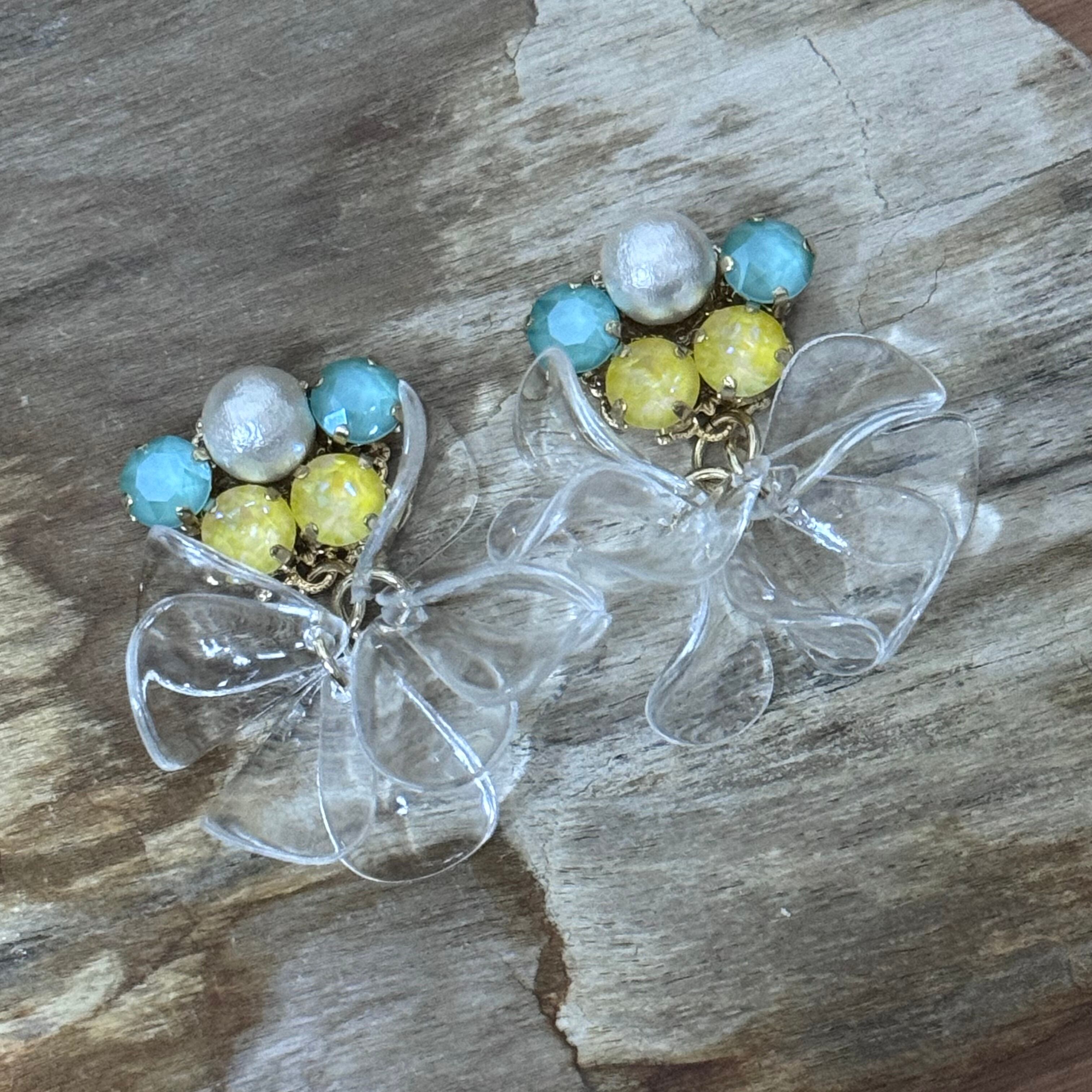 アクリルフラワーのクリアに春夏らしいカラーのスワロとコットンパールがポイントのアクセサリーです。