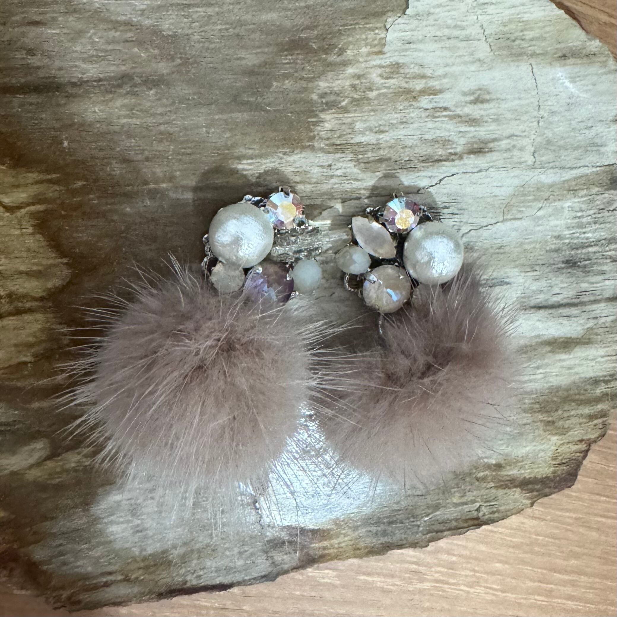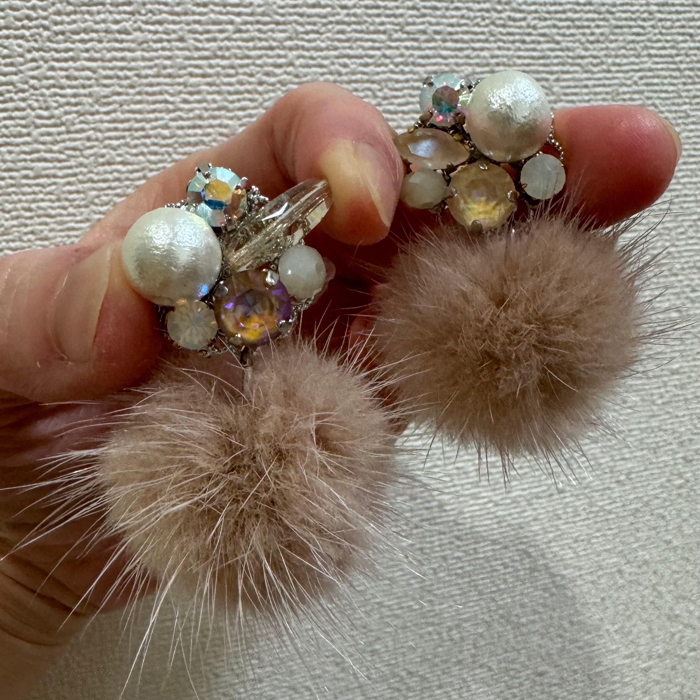 左右アシンメトリーなビジューデザインのピンクベージュのようなお色のミンクファーアクセサリーです!