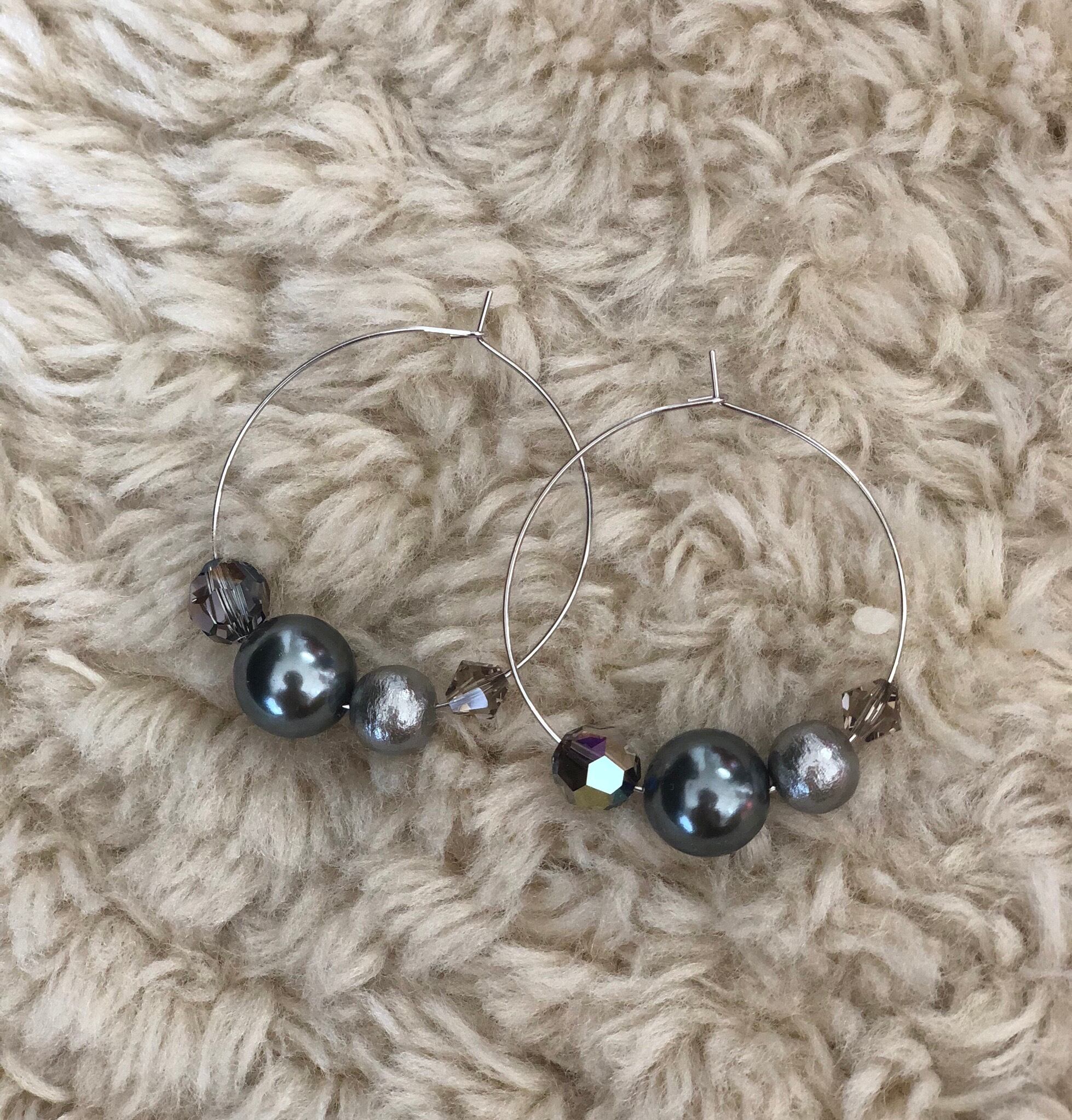 グレージュのスワロフスキー、シルバー系のコットンパール、つやパールの濃いシルバー系、グレージュ系にオーロラがかったスワロフスキー。