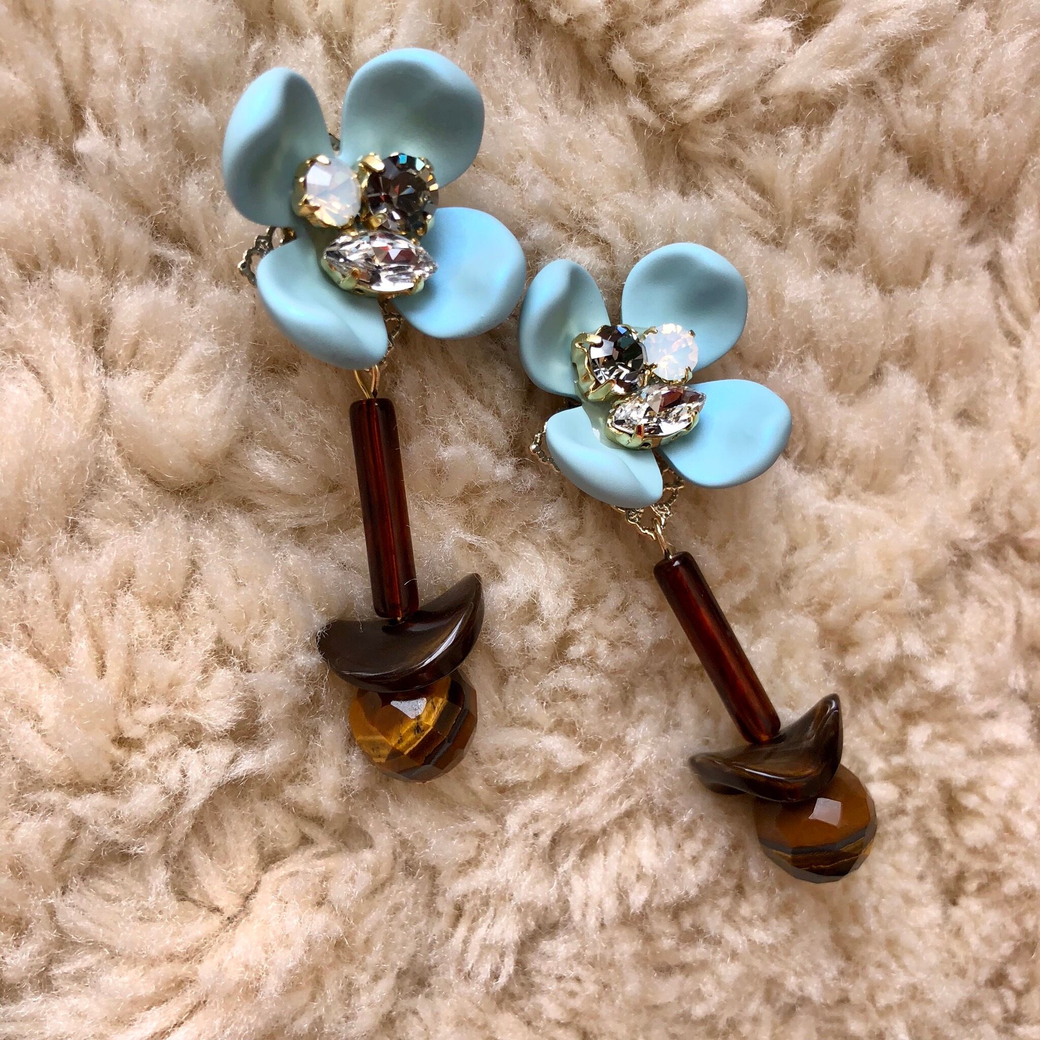 水色のお花とアクリルブラウンパーツ、天然石タイガーアイの色合わせが甘すぎずおとな可愛いですよ!